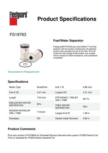 Fleetguard® FS19763 plus size EleMax™ fuel filter protects vital fuel system components. Its patented control valve provides full use of the filter, fits Fuel Pro® and many Diesel Pro® models, has multiple micron ratings for OEM compliance, and is biodiesel compatible.Specification